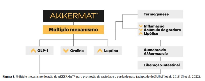AKKERMAT® tem capacidade redutora da fome ao estimular a saciedade devido ao aumento da liberação do GLP-1 (glucagon-like peptide-1) (Joseph et al., 2021b) e estímulo de Akkermansia muciniphila (Yue et al., 2022), além de propriedades moduladoras de grelina e leptina.
